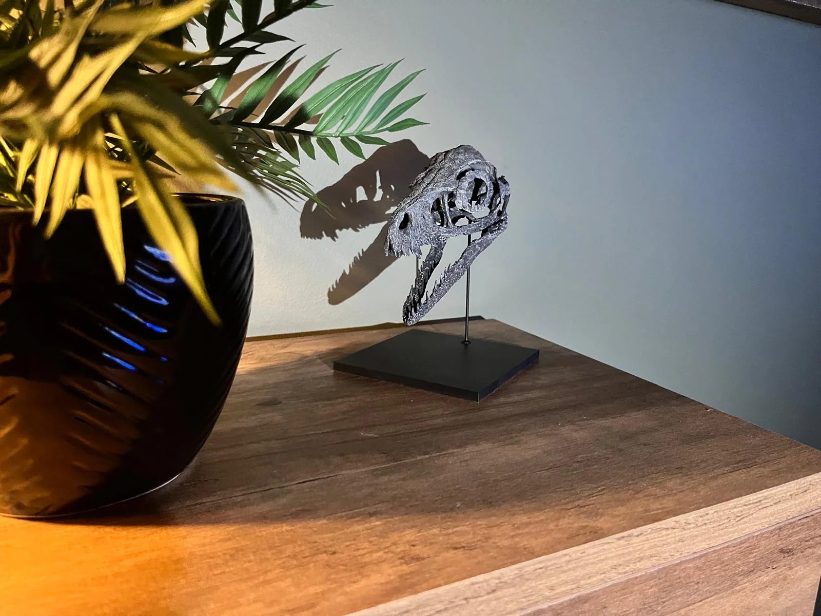 - Skull: Constructed from durable resin. High anatomical accuracy and magnificent details. Featuring a detailed unique black fossil bone paint scheme. Features an internal metal armature for strength and stability.